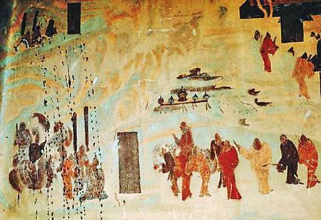 出土的高臺地埂坡胡人墓、西安安伽墓、史君墓、青海郭里木吐蕃墓棺板畫中都有關(guān)于商隊運(yùn)營的場面,敦煌莫高窟壁畫、唐三彩中的胡商俑等,都為我們提供了生動的圖像資料。