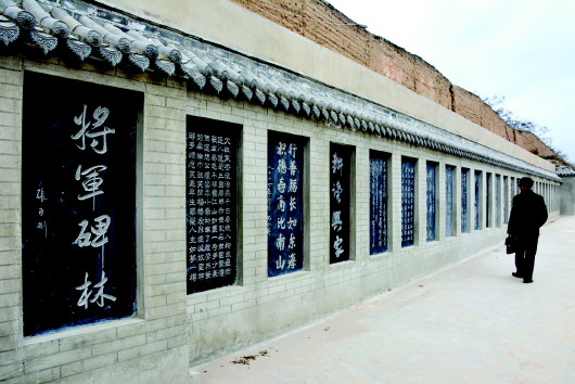 中岔古堡一堡三院,分為前院、中院、后院。走進古堡,堡門左側(cè)建有戲樓,上書“中岔劇場”四字。戲樓(又稱戲臺)始建于清光緒年間,上世紀六七十年代曾重修過。近堡門處右側(cè)堡墻下修建有兩處一體化的石碑長廊一直通向后院,碑廊中石碑一塊接著一塊砌筑在青磚墻內(nèi),石碑與石碑之間以青磚分隔,上覆筒瓦和滴水防護,每一通石碑上都刻有中華人民共和國將軍書寫的一幅書法作品。第一通石碑上甘谷籍將軍張臣剛書寫的“將軍碑林”四字分外醒目,劉精松、邢世忠、裴懷亮、李乾元等數(shù)十位叱咤風(fēng)云的共和國將軍書寫的書法碑刻依次嵌進墻內(nèi),組成一個氣勢磅礴、雄偉壯觀的將軍書法長廊,這就是新建的將軍碑林。