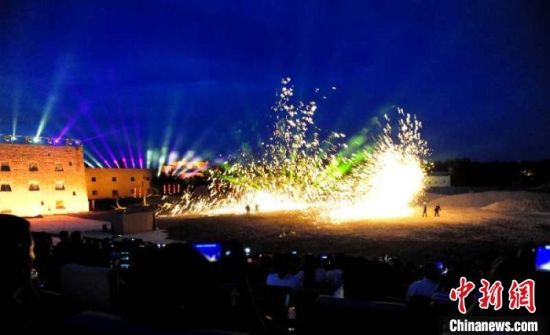 圖為沙漠實(shí)景劇《敦煌盛典》的演出現(xiàn)場(chǎng),觀眾在“穿越”古今的賞劇體驗(yàn)中感觸絲路文化。 康錦虎 攝