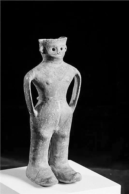 最特別的就是他雙腳上的鞋子,看上去完全是一雙高腰靴子,而且腳型巨大。陶器人體中空,可以盛水,插入褲兜的雙臂形成陶罐的雙耳,設(shè)計(jì)十分大膽精巧。