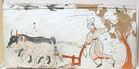此后,在酒泉丁家閘十六國(guó)墓壁畫中就只有一牛牽引的雙轅犁了。說(shuō)明魏晉時(shí)期是中國(guó)從二牛單轅犁過(guò)渡到一牛挽拉雙轅犁的時(shí)代,這一過(guò)渡的狀況及特點(diǎn)出現(xiàn)在嘉峪關(guān)地主墓葬壁畫中,又說(shuō)明甘肅是這一重大農(nóng)技改革的地區(qū)之一。