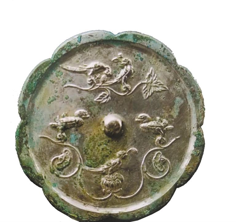 隋唐時(shí)期是中國封建政治經(jīng)濟(jì)文化高度發(fā)展繁榮的時(shí)期,唐代社會經(jīng)濟(jì)全面發(fā)展,手工業(yè)各部門也都興旺發(fā)達(dá),青銅鑄造業(yè)中的銅鏡業(yè)尤為突出,無論造型、題材、紋飾、鑄造工藝,都突破了前代的模式,達(dá)到了中國古代銅鏡藝術(shù)的巔峰。唐鏡鏡型厚實(shí),方形鏡、菱花形鏡、葵花形鏡流行;紋飾題材多見瑞獸、飛鳥以及葡萄、花草等;瑞獸葡萄鏡最具特色,是中西文化融合的杰作。