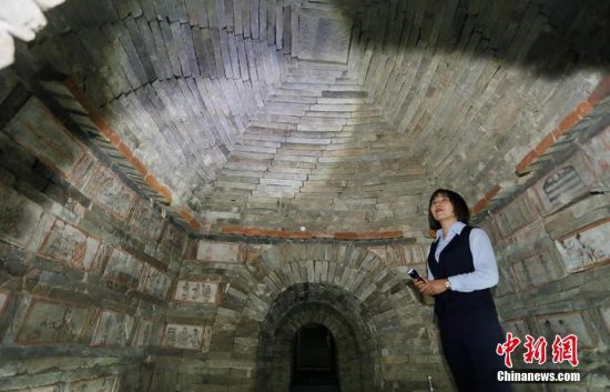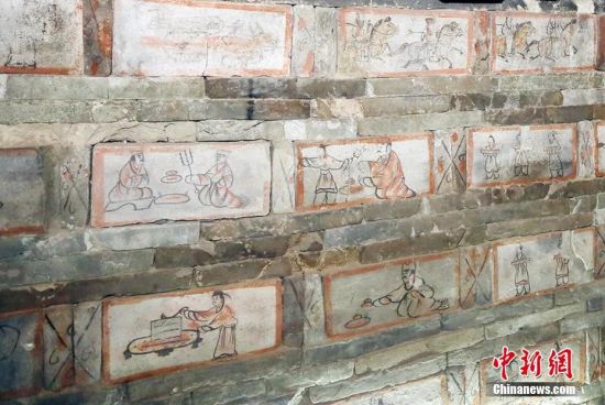 位于甘肅嘉峪關(guān)市的嘉峪關(guān)新城魏晉墓群,內(nèi)有千余座魏晉古墓,從1972年起,先后發(fā)掘18座,其中9座為畫像磚墓。磚壁畫取材于現(xiàn)實(shí)生活,用連環(huán)畫的方式反映出了當(dāng)時(shí)河西地區(qū)生活、生產(chǎn)、軍事、文化的真實(shí)情景,具有濃厚的生活氣息。目前只開放的六號墓,其壁畫內(nèi)容豐富,具有很強(qiáng)的代表性。高展 攝