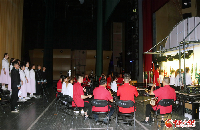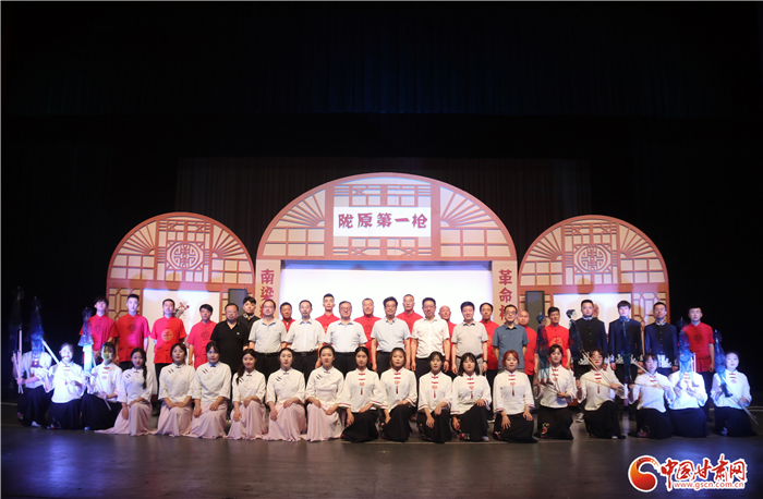 《隴原第一槍》全劇分希望、播火、誆宴、奪槍、功捷5場(chǎng),演出團(tuán)隊(duì)分為前臺(tái)演唱組、樂(lè)隊(duì)伴奏組、影人挑纖組、嘛簧幫唱組,演職人員中有國(guó)家級(jí)非遺代表性傳承人2人,省級(jí)非遺代表性傳承人2人,市級(jí)、縣級(jí)代表性傳承人近10人,加上隴東音樂(lè)學(xué)院學(xué)生共50人參與了演出。