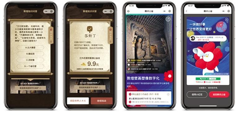 “云游敦煌”的“聲動畫語”讓壁畫“活”了起來,用戶可以通過觸點的方式進入到不同的篇章中,通過動畫欣賞敦煌壁畫中晚唐時期的生活場景,并獲得與當(dāng)時社會民俗、服飾等相關(guān)的文化知識。觀看完動畫后,用戶還可以通過參與文化問答挑戰(zhàn),為中國敦煌石窟保護基金會募集善款。答對題目越多,募集到的善款也將隨之增多。款項將由騰訊公益慈善基金會直接出資,并全部用于敦煌莫高窟第427窟、145窟、138窟的數(shù)字化保護工程。通過這種方式讓每一位參與的用戶,都能夠用自己的知識為石窟數(shù)字化保護助力,成為新時代的敦煌“數(shù)字供養(yǎng)人”。