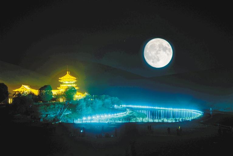 中秋時節(jié),敦煌涼風(fēng)習(xí)習(xí),暑氣漸消,鳴沙山?jīng)]有酷熱,只有柔軟的沙。白天你可以在鳴沙山騎駱駝、滑沙、駕駛沙漠卡丁車、跳傘、沙浴、沙療,與鳴沙山·月牙泉來一次徹底的親密接觸,而當夜幕降臨,沒有一聲寒暄,也用不著預(yù)告,一輪圓潤皎潔的明月緩緩從山邊升起,你可以在這里看聚沙為山,銀光閃動,滿月下的鳴沙山竟如此優(yōu)雅而迷人。