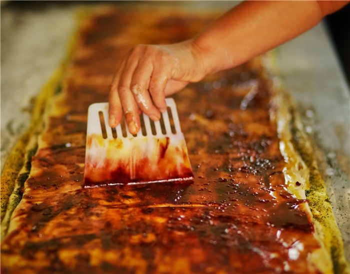 將放好佐料的層層面餅拉扯,卷成筒狀。