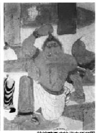 這幅壁畫講了這樣一個(gè)故事:外道勞度叉,約佛教弟子舍利弗斗法,失敗的一方要么選擇自盡,要么放棄原有的信仰而皈依佛門。經(jīng)過(guò)一番殊死搏斗,失敗后的外道,向舍利弗投降跪拜。