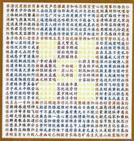 蘇蕙《璇璣圖》不僅是一束厚重的文學奇葩,也是一幅充滿創(chuàng)意的藝術(shù)巨制。她將詩歌的載體從傳統(tǒng)簡帛紙張轉(zhuǎn)換成為錦。錦是有彩色花紋的高級絲織品。以錦為書寫材料制作《璇璣圖》,除詩歌本身的創(chuàng)作外,首先需要染絲紡織。錦織好后,又要對《璇璣圖》謀篇布局,劃區(qū)設色,書詩于錦,然后一針一針地將它繡出來,變?yōu)榛匚腻\字。那每一道工序,要求都極精細,不得有半點疏忽,不然就會留下污點和遺憾。蘇蕙集眾藝于一身,完美地將其制作出來,體現(xiàn)了她的綜合藝術(shù)才能。取名“璇璣(泛指北斗)圖”,寓意它像北斗,可以旋轉(zhuǎn)地讀。它是在華美的錦上,又以五彩繽紛的絲線繡上《璇璣圖》,不僅顏色更加艷麗,而且那841個金玉珠璣般文字,展現(xiàn)的令人眼花繚亂的詩歌園地,更是前不見古人,后不見來者,比錦繡的光彩更加耀眼奪目。