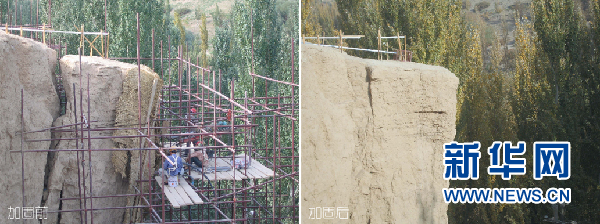 敦煌研究院古代壁畫與土遺址保護(hù)創(chuàng)新團(tuán)隊(duì)承接的新疆交河故城崖體加固項(xiàng)目前后效果對比(資料圖)。敦煌研究院 供圖
