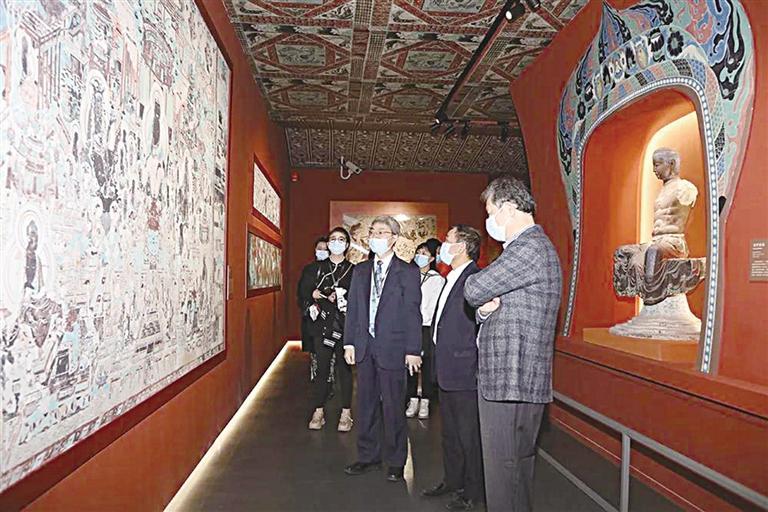 此次展覽分為“石窟藝術(shù)”“絲路重華”“萬象人間”三個(gè)單元。展期至3月20日結(jié)束。展覽調(diào)取了甘肅省博物館等10家博物館和文博單位的文物130多件(套),其中包括敦煌莫高窟第45窟、220窟、285窟與320窟的原大復(fù)制洞窟4座,敦煌壁畫、彩塑臨本40余件,高保真數(shù)字化壁畫復(fù)制品70余幅,以及仿制華蓋、佛塔等輔助展品20余件。