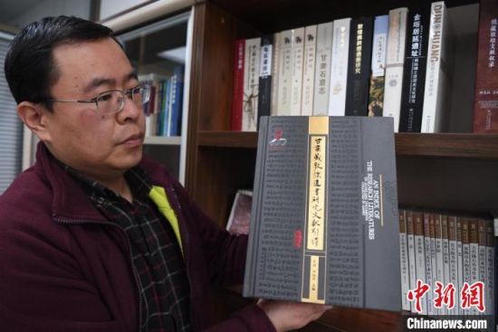 12月31日,甘肅教育出版社副社長白鑫展示近期出版發(fā)行的《甘肅藏敦煌遺書研究文獻引得》?!钇G敏 攝
