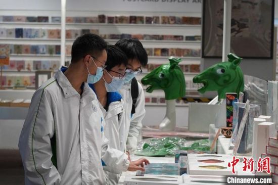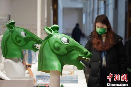 1月14日,甘肅省博物館文創(chuàng)中心的銅奔馬頭套吸引參觀(guān)者駐足觀(guān)看。連日來(lái),甘肅省博物館文創(chuàng)中心推出的以銅奔馬為主題的文創(chuàng)產(chǎn)品,如“神馬來(lái)了”銅奔馬頭套,“綠馬”出行口罩等產(chǎn)品備受歡迎。