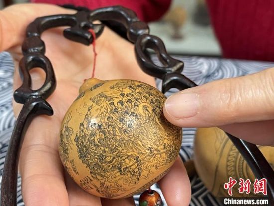 2月15日,蘭州市非遺傳承人陳兵在工作室展示自己雕刻的微雕作品,她擅長在雞蛋大小的葫蘆上雕刻敦煌壁畫、敦煌飛天,以及佛教經(jīng)文,一把刻刀上下翻飛之后,雕刻形象神態(tài)逼真。