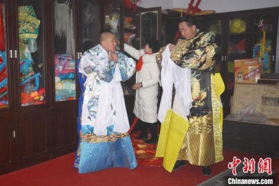 2月16日,表演者正在甘肅蘭州市永登縣苦水街穿上傳統(tǒng)戲服,準(zhǔn)備高高蹺表演?!【琶赖┰觥z