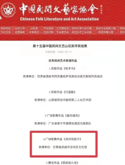 中國甘肅網(wǎng)3月14日訊(本網(wǎng)記者 張振國)近日,第十五屆中國民間文藝山花獎評獎結果公示,由武威市舞蹈家協(xié)會副主席付泓創(chuàng)作、武威市涼州區(qū)文化館表演的作品《涼州攻鼓子》榮膺該獎。該獎項的獲得,是武威市文藝創(chuàng)作和非遺保護傳承的又一優(yōu)秀成果。