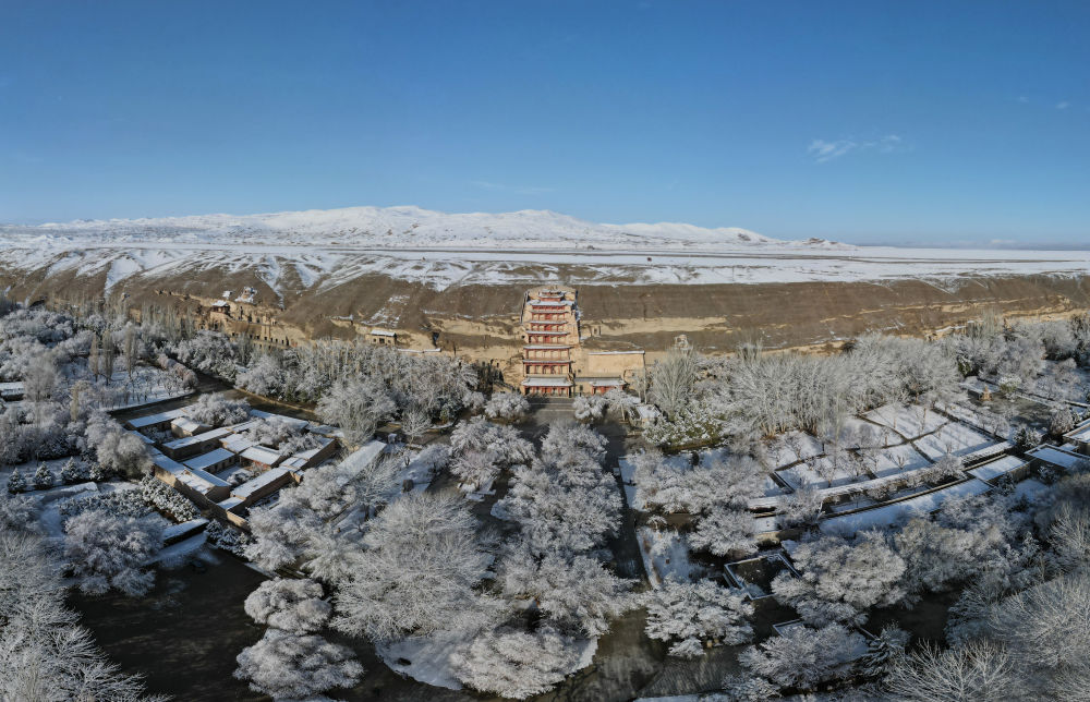 這是3月25日拍攝的敦煌莫高窟景區(qū)雪景(無人機照片)。新華社記者張智敏 攝