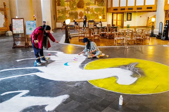 5月8日,母親節(jié),酒泉敦煌市沙文化館以敦煌莫高窟九色鹿壁畫為摹本,以彩色沙為原料,5人團隊通力合作,在敦煌鳴沙山下的敦煌山莊大堂“繪制”出長10米寬6米的大型九色鹿沙畫,同時“繪制”了一幅“三兔藻井”沙畫圖案,寓意天下母親“福祿安康”“一路平安”,祝天下母親節(jié)日快樂。