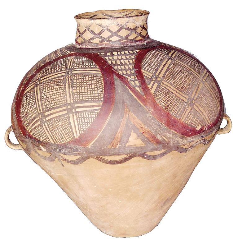 姓名:馬家窯文化半山類型四大圓圈雙耳彩陶罐 出生年代:距今約4650—4350年左右 住址:永靖縣博物館 體型:高46.6厘米,口徑15.6厘米,底徑12.2厘米 自我描述: 我是半山類型中的精品,屬于國(guó)家一級(jí)文物。泥質(zhì)紅陶,口沿微侈,直粗頸,闊肩,鼓腹,平底,腹有對(duì)稱雙耳,施黑紅彩,內(nèi)口飾水波紋六組,外口飾網(wǎng)紋,肩腹飾四大圓圈旋渦紋,間飾弧線鋸齒紋,腹中部飾寬帶紋,水波紋各一條,器型個(gè)體較大,胎體光滑,紋飾精致,色彩鮮艷。