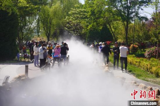 5月16日,甘肅蘭州,寓言故事園化身“瑤池”仙境美景,吸引不少市民前來觀賞、拍照?!【琶赖┰觥z