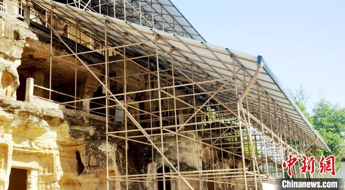 在北石窟寺,多體量多結(jié)構(gòu)腳手架支撐起保護(hù)棚,窟龕輪廓若隱若現(xiàn)。崔惠萍介紹說(shuō),該防水工程,屬于實(shí)驗(yàn)性,于2021年3月建成,能最大程度覆蓋遮擋崖體,保護(hù)崖面窟龕,防止雨水對(duì)石窟的沖蝕破壞。