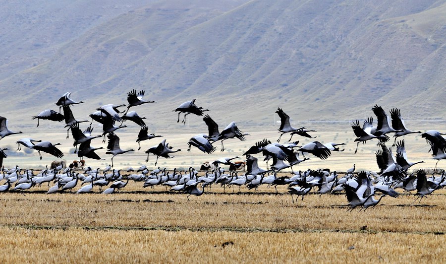 人民網(wǎng)蘭州10月10日電 (記者高翔)寒露至、候鳥遷,甘肅省肅南裕固族自治縣皇城鎮(zhèn)夏日塔拉草原迎來數(shù)千只蓑羽鶴,它們在濕地的水面上、草叢中或悠閑覓食、或蹁躚起舞,與色彩斑斕的草原構(gòu)成了一幅和諧優(yōu)美的生態(tài)畫卷。