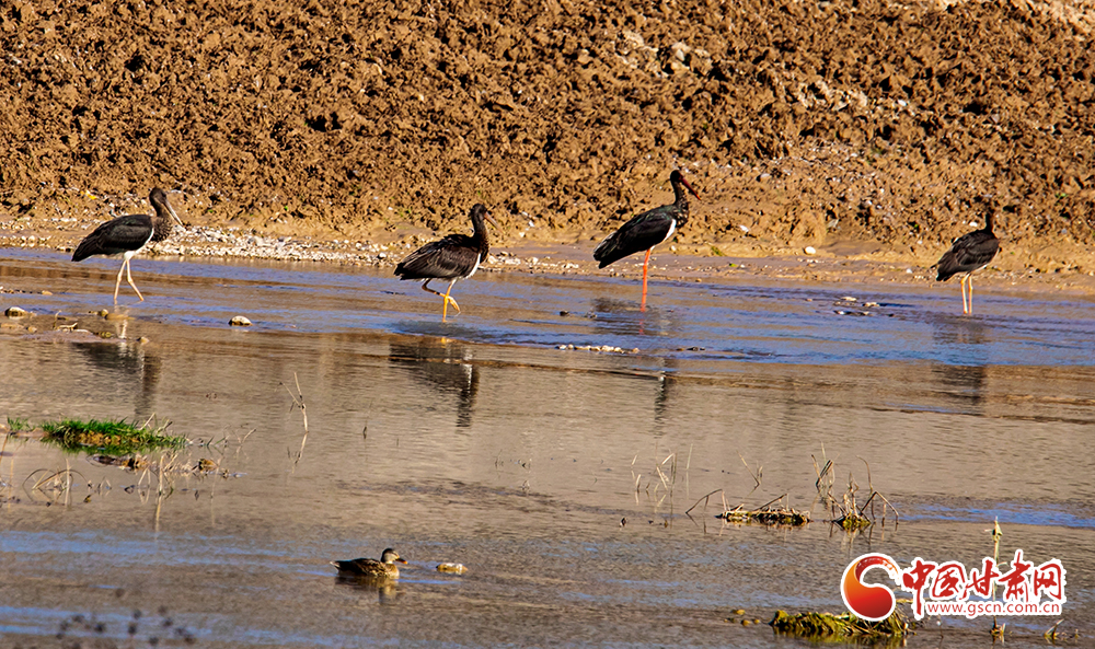 近日,大批被比喻為鳥中“大熊貓”的黑鸛在平?jīng)鍪谐缧趴h汭河棲息,它們身軀挺拔,纖頸長腿,姿態(tài)優(yōu)美,或悠閑覓食,或展翅翱翔。