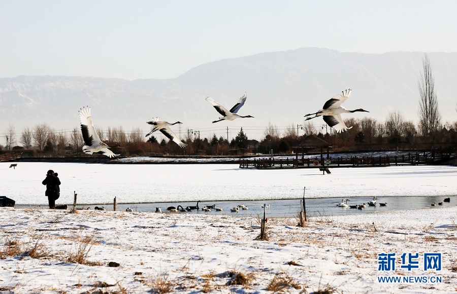2月14日,雪后初晴,甘肅省張掖國家濕地公園放飛的十余只丹頂鶴翩翩起舞、嬉戲覓食,使雪后的濕地公園充滿生機(jī)。新華網(wǎng)發(fā)(陳禮 攝)