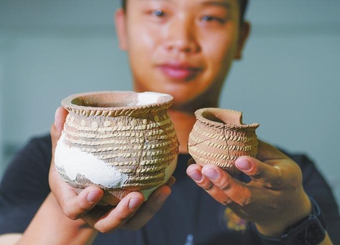 考古工作人員展示南佐新石器時代遺址內(nèi)出土的箍白泥附加堆紋夾砂陶罐。