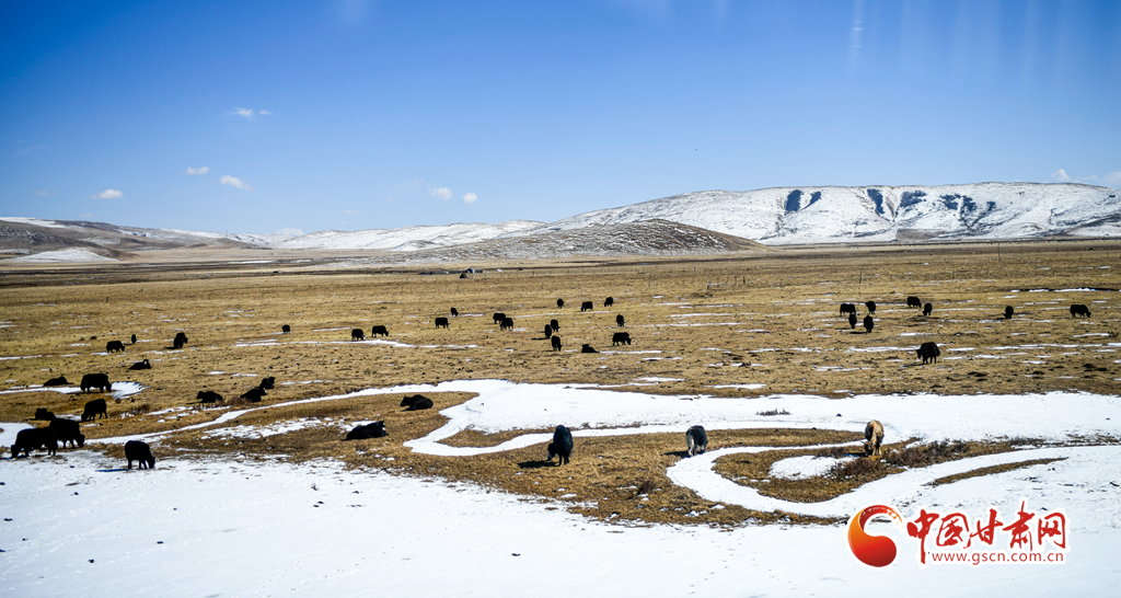 3月8日,甘肅省甘南藏族自治州碌曲縣境內再次出現(xiàn)降雪天氣,雪后初霽,大地銀裝素裹,山間云霧繚繞,牛羊成群結隊在雪原中奔跑、覓食,構成一幅和諧的生態(tài)畫卷。