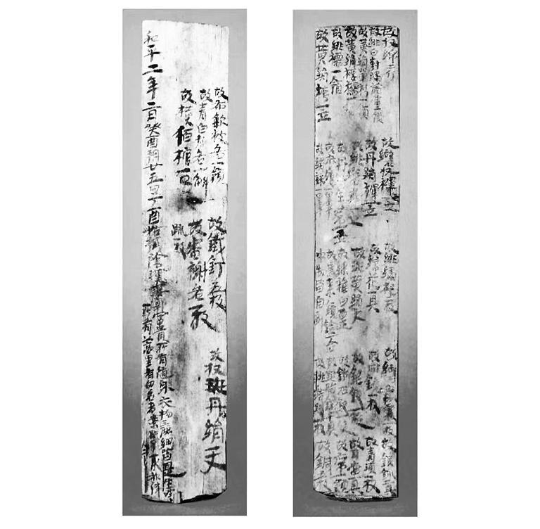 衣物疏木質(zhì),保存基本完好,長37.2厘米,寬6.5-6.9厘米,厚0.6-1.1厘米。衣物疏在墓中的主要作用是記載墓主隨葬衣飾和物品的名稱及數(shù)量。由于保存較好,此衣物疏上的字跡至今清晰可辨。衣物疏背面有“和平元年姑臧陰漢妻郭富貴”字樣,據(jù)此內(nèi)容可知這件衣物疏為前涼姑臧(今武威)居民陰漢之妻郭富貴亡故后的隨葬衣物疏,且極有可能出土于姑臧(今武威)。