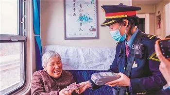 7505/7506次列車長在途中為老年旅客辦理現(xiàn)金補票業(yè)務。強 科 攝