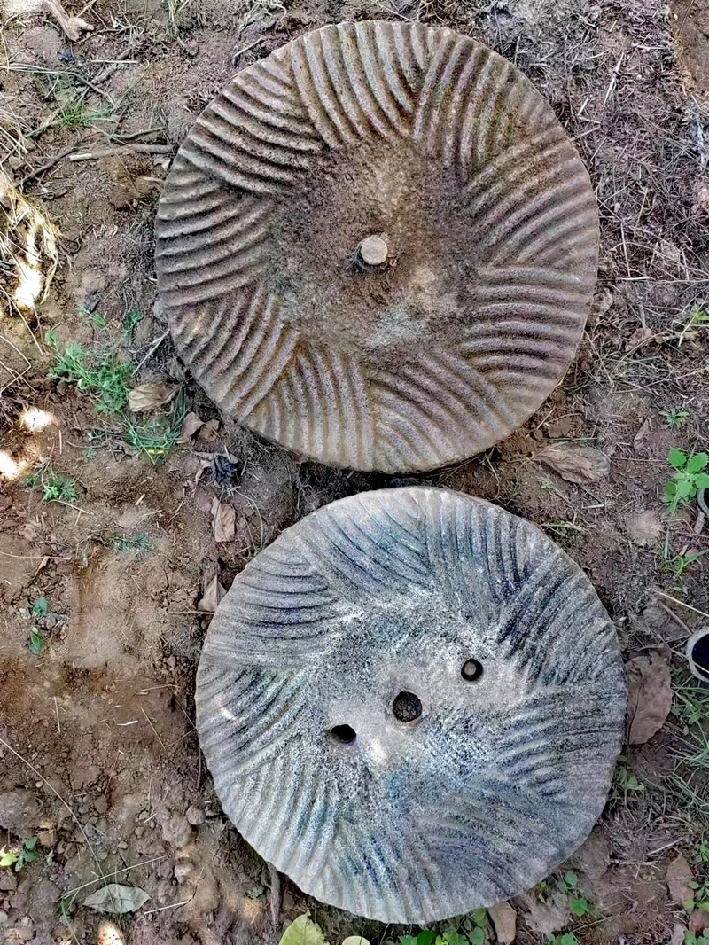 鑿石磨,其實(shí)也就是礪紋利齒。首先,將上扇抬起來(lái)放在地上鑿,下扇是固定在磨盤上面的,搬一條高凳子坐在上面鑿。上下兩扇的磨齒排列有序,互相對(duì)稱咬合,呈扇狀向四周延伸,極其科學(xué)合理。石匠就是把這些變鈍了的磨齒一錘一纖鑿鋒利。