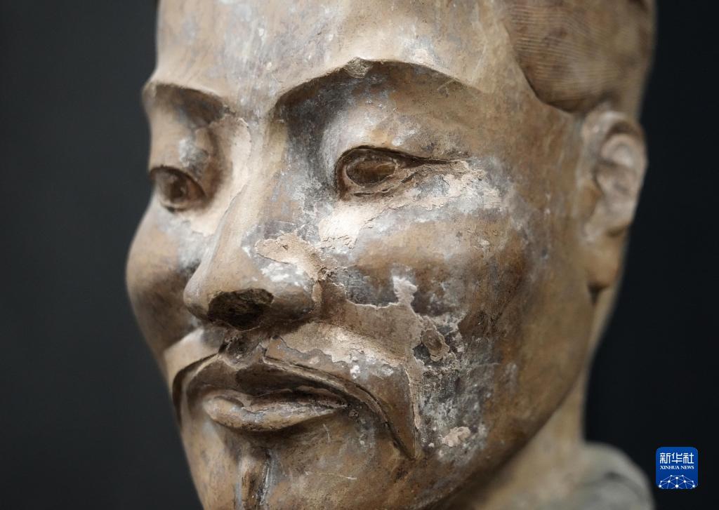 在秦始皇帝陵博物院文物保護(hù)部彩色陶俑修復(fù)室內(nèi),一尊秦俑臉部尚存部分彩繪層。秦俑五官的精準(zhǔn)塑造顯示出秦代匠人具有高超的寫實能力(8月23日攝)。