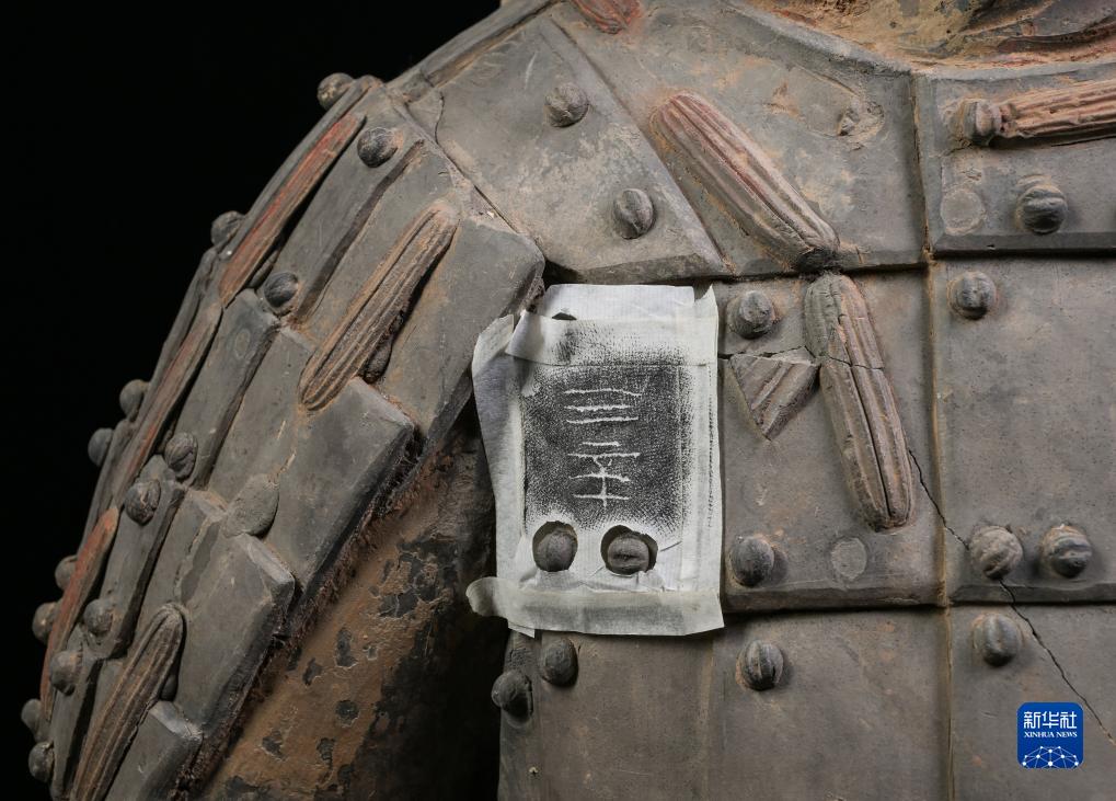 在秦始皇帝陵博物院文物保護(hù)部彩色陶俑修復(fù)室內(nèi),修復(fù)人員使用墨拓技術(shù)在一尊秦俑的胸前甲片上還原出“三辛”字樣的刻痕。據(jù)介紹,這應(yīng)是制作該秦俑的秦代工匠名(8月23日攝)。