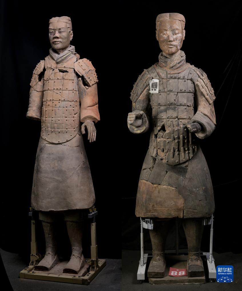 兩尊經(jīng)過修復(fù)的彩色秦俑佇立在秦始皇帝陵博物院文物保護(hù)部彩色陶俑修復(fù)室內(nèi)(拼版照片,8月23日攝)。
