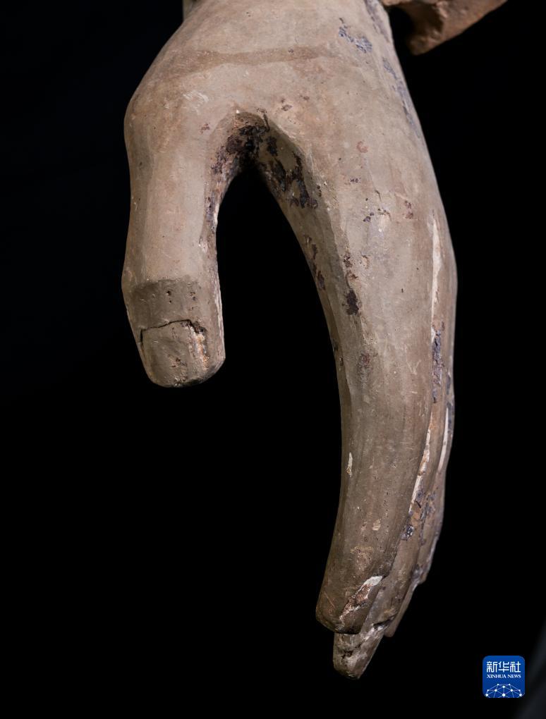 在秦始皇帝陵博物院文物保護(hù)部彩色陶俑修復(fù)室內(nèi),一尊秦俑的手部特寫顯示出豐富的細(xì)節(jié)(8月23日攝)。