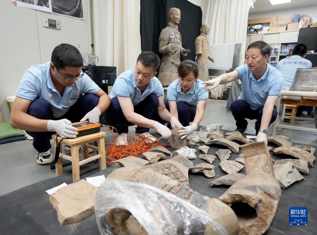 技術(shù)人員在拼接秦俑軀干殘片(8月23日攝)。