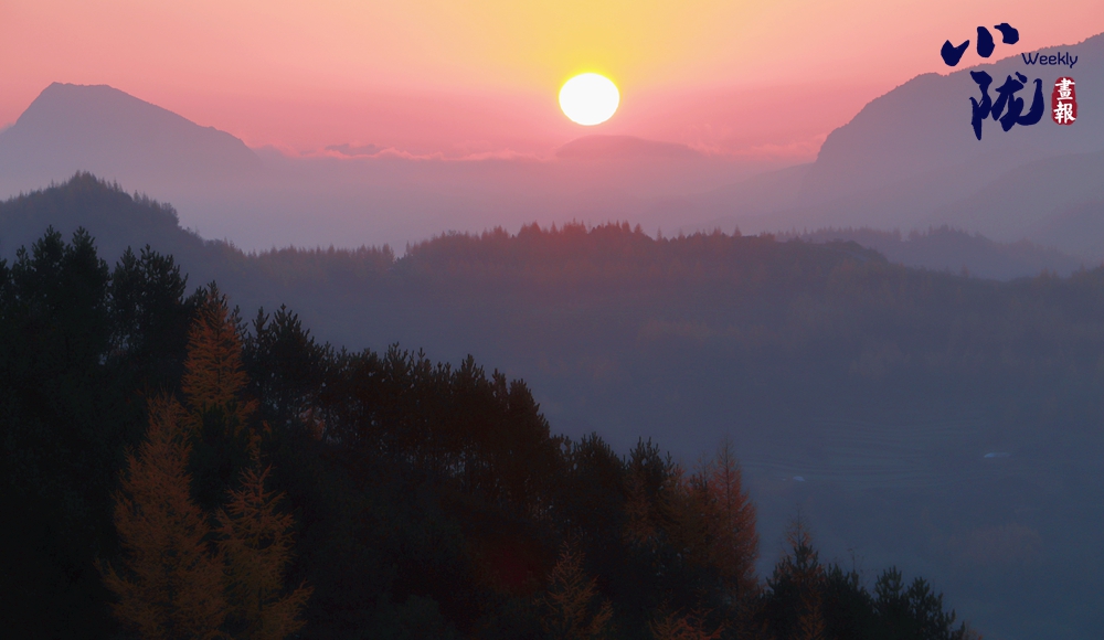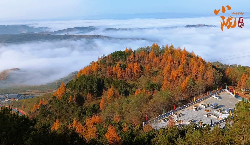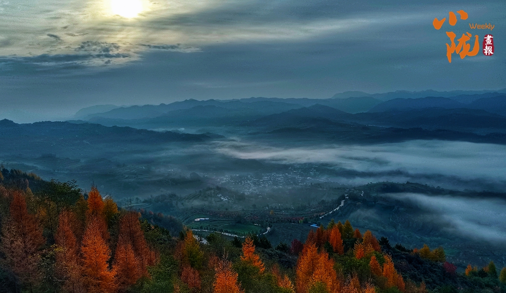 天空中布滿了烏云,云隙中的陽光和從四面八方漫過來的云霧、滿山彩林,把云華山點(diǎn)綴得像一幅筆墨清爽、疏密有致山水畫。