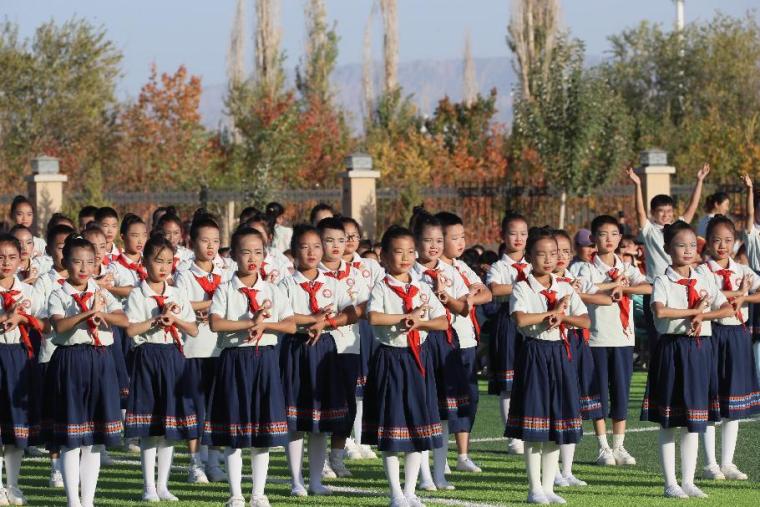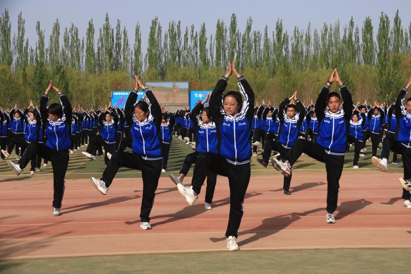 敦煌中學(xué)學(xué)生在操場(chǎng)做敦煌舞課間操。張曉亮 攝