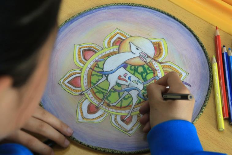 敦煌市西關(guān)小學(xué)美術(shù)社團(tuán)的學(xué)生正在為帶有敦煌壁畫元素的團(tuán)扇畫圖上色。張曉亮 攝