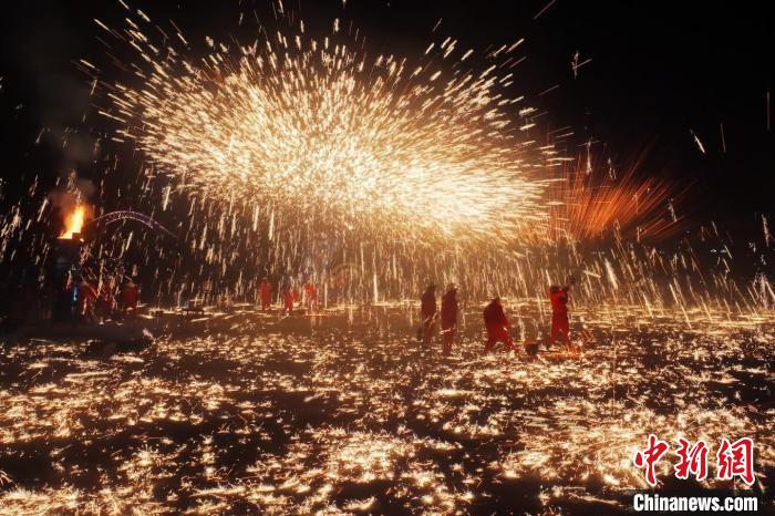 永靖王氏鑄造技藝傳承人在永靖黃河岸邊表演了國(guó)家級(jí)非物質(zhì)文化遺產(chǎn)“打鐵花”,讓民眾享受了一場(chǎng)視覺盛宴。侯奇志 攝