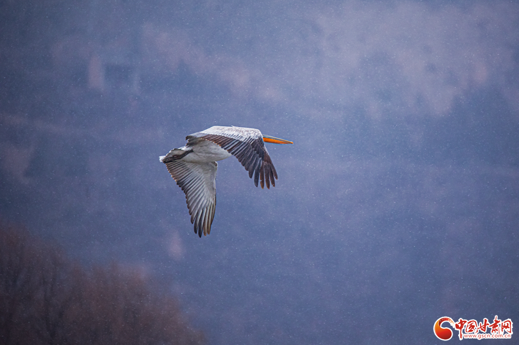 當天,天空下著大雪,天氣寒冷,一位野生鳥類攝影愛好者驚喜地在崇信縣汭河段發(fā)現(xiàn)了一只卷羽鵜鶘盤旋于河道上空,經(jīng)過跟蹤其降落于發(fā)現(xiàn)地20里外的銅城水庫附近水域,與蒼鷺混群。
