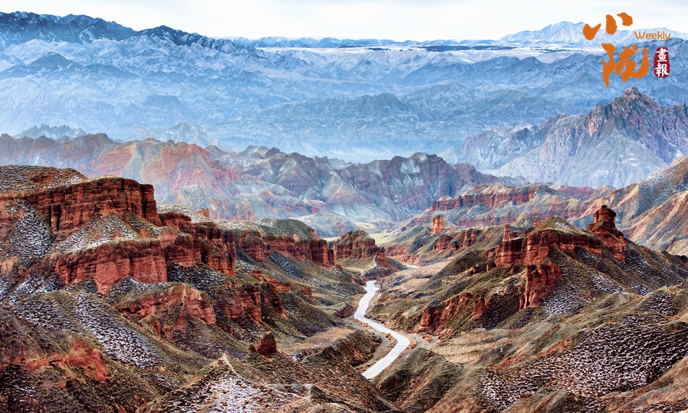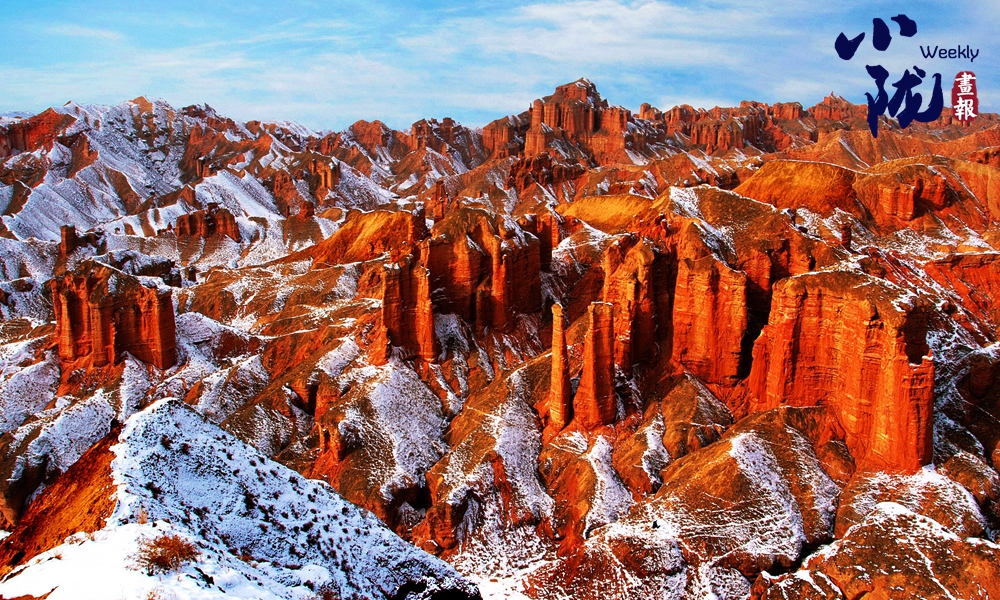 雪后,赤紅色的丘陵充滿陽(yáng)剛之美,白雪宛如輕紗浸在丹霞山上,顯得格外艷麗多彩、如夢(mèng)如幻。