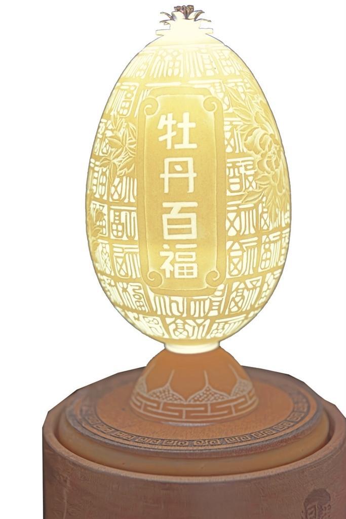 楊星國雕刻過的作品達兩千多件,作品《牡丹亭》是他用最新的拼雕手法創(chuàng)作的,鴕鳥蛋殼細分成300片,打磨成“瓦片”樣,逐片貼成古建筑中亭頂蓋狀,形成牡丹亭之樣,做成外層的“亭”;內(nèi)層的“牡丹”則用鴯鹋蛋殼,利用其自然色,依照牡丹層層雕透,第一層深墨、第二層墨綠、第三層淡綠、第四層白色從外到內(nèi)雕刻,作品既有國畫的神韻又有雕刻的立體藝術之美。浮雕、陰雕、陽雕、鏤空雕、拼雕等手法,在《牡丹亭》作品里全部顯現(xiàn)。為了讓作品表達的效果更充分,楊星國又加了一些機械原理讓其旋轉(zhuǎn),還加了燈光,于是,3個鴕鳥蛋殼與1個鴯鹋蛋殼在楊星國的巧妙構思中有了全新的生命。
