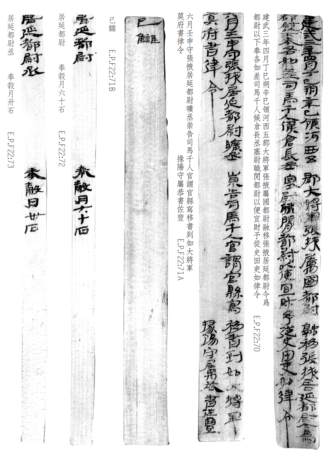 這封冊(cè)書(shū)記載了建武三年,竇融管轄河西時(shí)發(fā)布的一條關(guān)于都尉以下官吏奉谷等差的命令。根據(jù)竇融發(fā)布的新規(guī)定,我們可以看到,秩比二千石的居延都尉月奉谷僅為六十石,史書(shū)有“十斗一斛”及“十斗一石”的記載,此六十石即是六十斛,相比于史書(shū)記載中比二千石每月百斛的俸例要少,而其余官吏的俸祿也相應(yīng)要少,雖然漢代不同時(shí)期的官吏俸祿存在變化,但對(duì)比所見(jiàn)的這種情況,可能也跟兩漢之交戰(zhàn)亂頻仍的社會(huì)環(huán)境有重要關(guān)系。