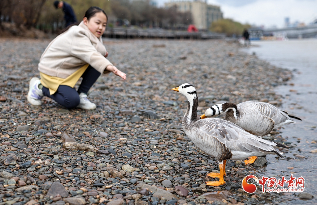 當(dāng)日,在蘭州市城關(guān)區(qū)黃河河畔,一對(duì)斑頭雁與市民溫馨相遇,吸引不少市民駐足投喂,拍照“打卡”。