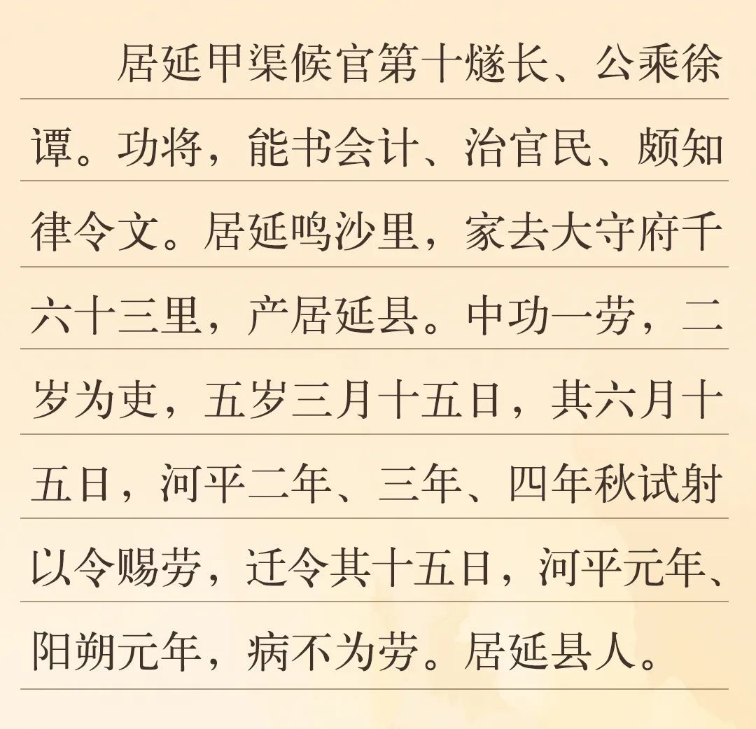 “中功一勞”中的“中功”指得到的功。功、勞、功勞、功績,是漢代計算政績的名稱與單位,戍卒與官員每日巡視、抵御外敵、參與秋射等,都能積攢“功”、“勞”。簡文中提到了“河平二年、三年、四年秋試射以令賜勞”,“秋試射”即漢代秋季比武活動之一的秋射。秋射成績優(yōu)秀可以賞賜勞績,漢代邊塞地區(qū)出土的簡牘中有大量以秋射獲勞的記錄,“功”與“勞”積攢到一定程度,便可升遷。當這位官員所屬的候官發(fā)現(xiàn)空缺,便以功勞案為依據(jù),給出官員任免方案,呈報都尉府,以進行官員的升遷調(diào)動。