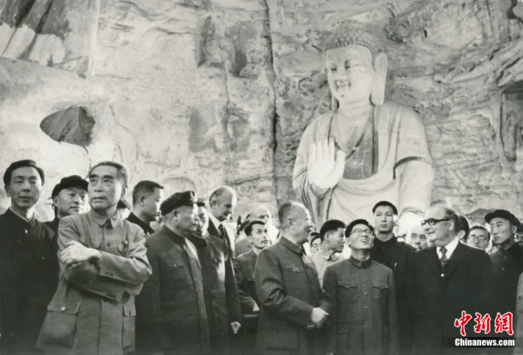 1973年9月15日,周恩來總理陪同時任法國總統(tǒng)喬治·蓬皮杜視察云岡石窟。云岡研究院 供圖