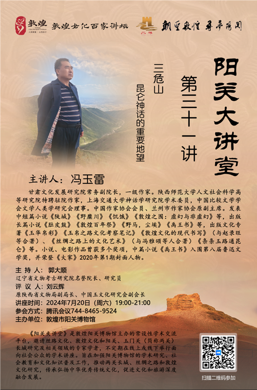 中國甘肅網(wǎng)7月18日訊 7月20日,西北師范大學(xué)甘肅文化發(fā)展研究院常務(wù)副院長(zhǎng)、一級(jí)作家、玉文化學(xué)者馮玉雷將在線進(jìn)行題為《三危山:昆侖神話的重要地望》的講座。本次講座由敦煌陽關(guān)博物館主辦,為“敦煌文化百家講壇”第31講,遼寧省文物考古研究院名譽(yù)院長(zhǎng)、資深考古學(xué)家、玉學(xué)家郭大順研究員擔(dān)綱主持,陜西省文物局原副局長(zhǎng)、中國玉文化研究會(huì)副會(huì)長(zhǎng)、資深玉學(xué)家劉云輝教授擔(dān)綱評(píng)議。